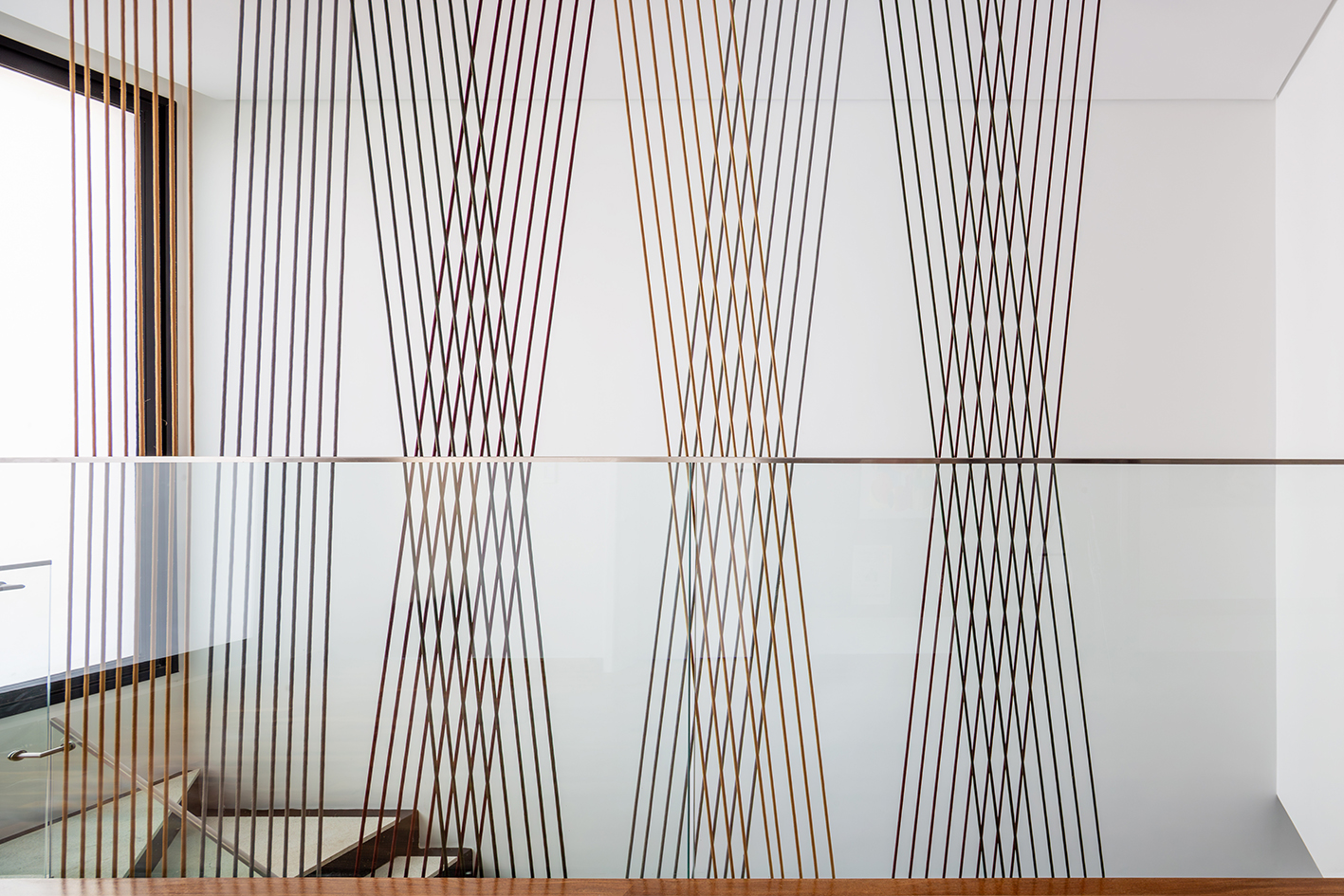 La combinación de materiales refuerza la identidad del proyecto. La madera aporta calidez, la piedra añade textura, mientras que los elementos de metal y cuerda —utilizados en una instalación artística a medida diseñada por Superlimão— aportan ligereza estructural. La pieza recorre verticalmente el hueco de la escalera, creando un gesto arquitectónico que conecta las plantas con ritmo y fluidez. Casa MK es un reflejo de la arquitectura como experiencia vivida —adaptable, integrada y festiva— en cada detalle de la vida cotidiana.