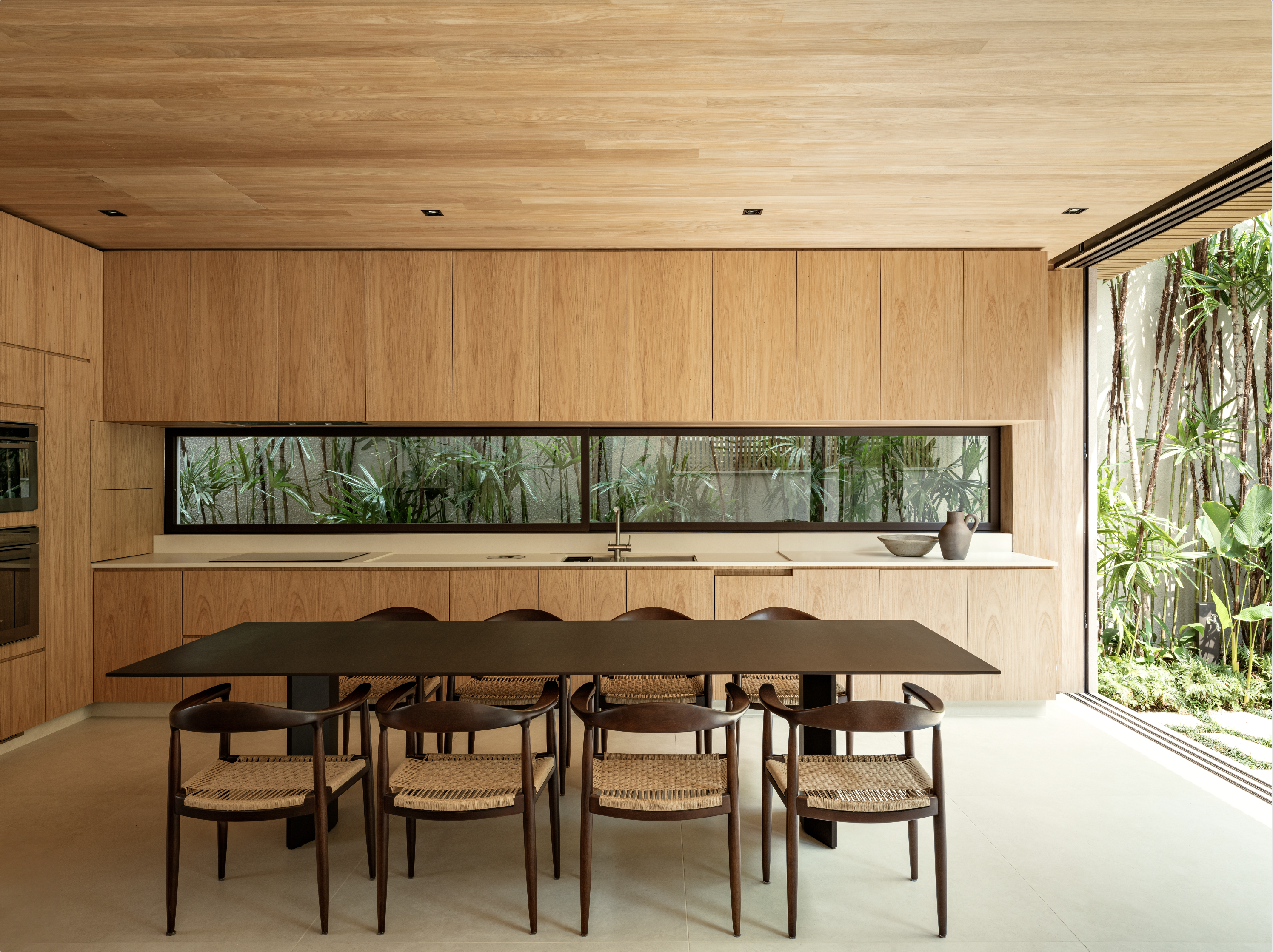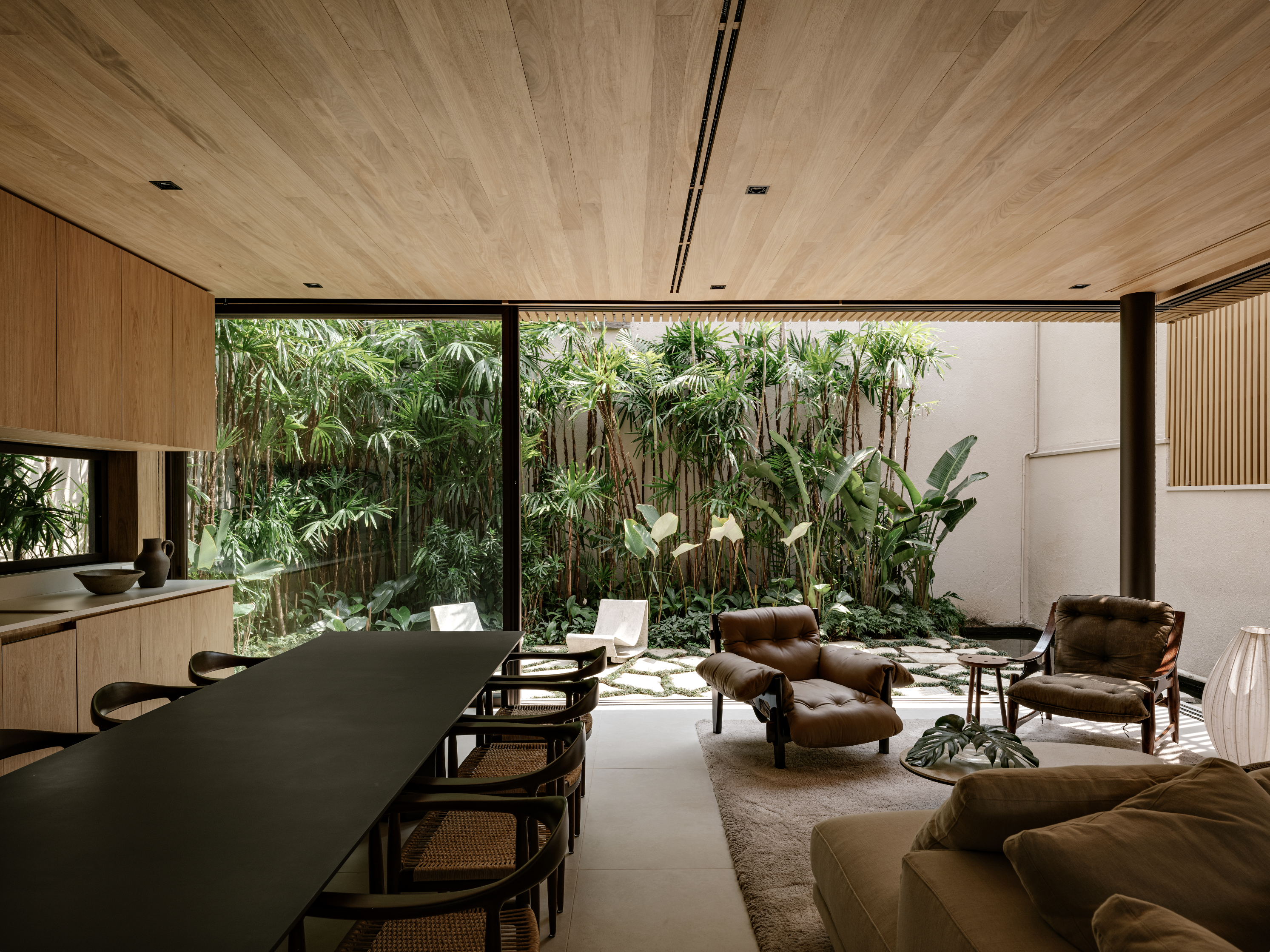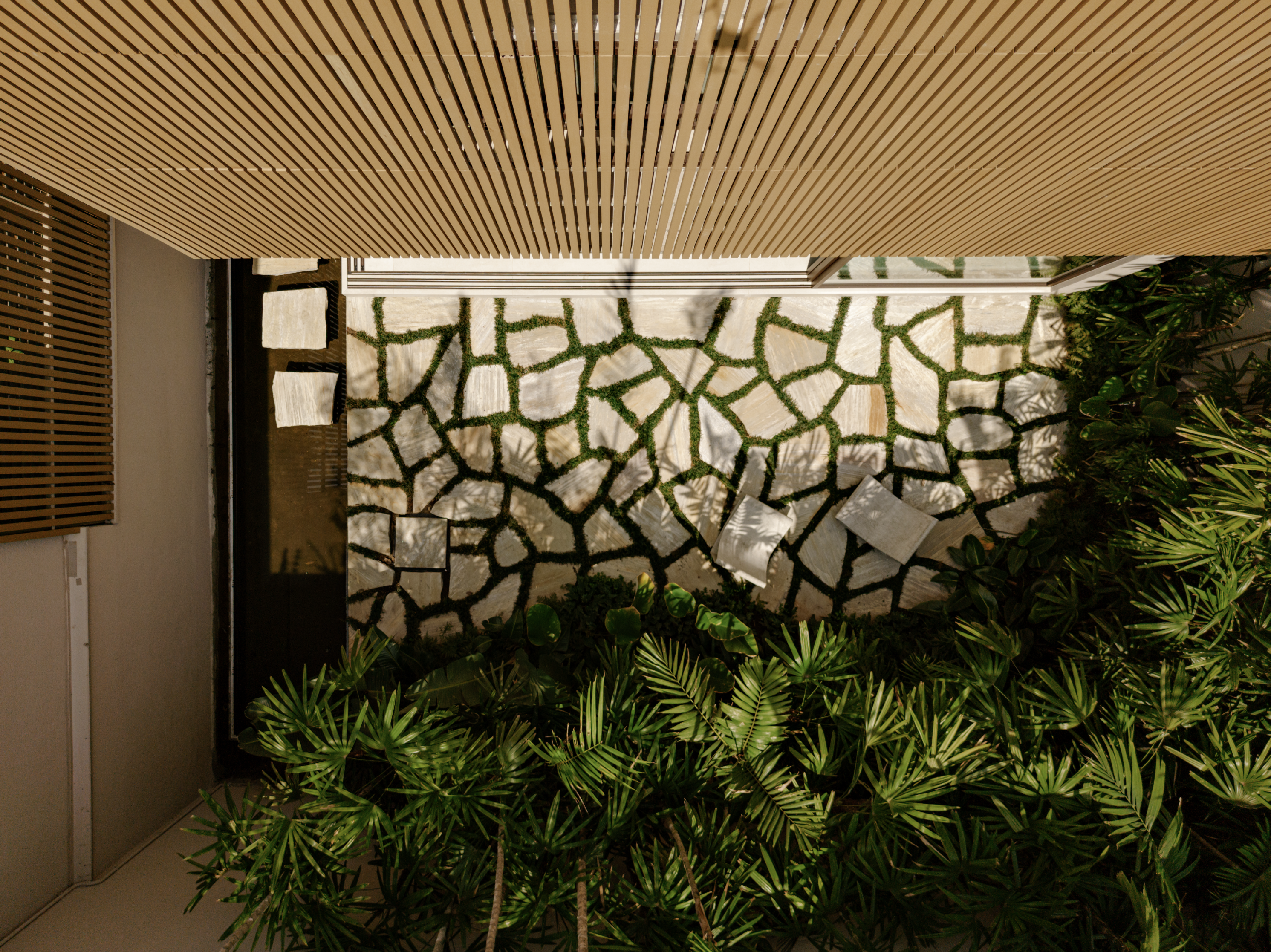 elementos naturales como chapas de madera en paneles y muebles de carpintería, así como piedra natural aplicada a paredes y suelos exteriores. Paisajismo integrado El proyecto de paisajismo, firmado por Rodrigo Oliveira Paisagismo, desempeña un papel fundamental en la composición.Una exuberante vegetación tropical rodea el volumen construido, creando una barrera visual para los muros limítrofes y acentuando la sensación de privacidad y acogimiento.