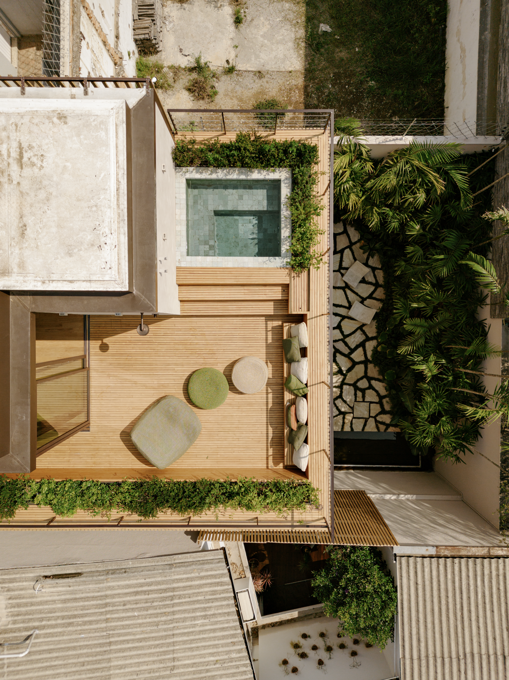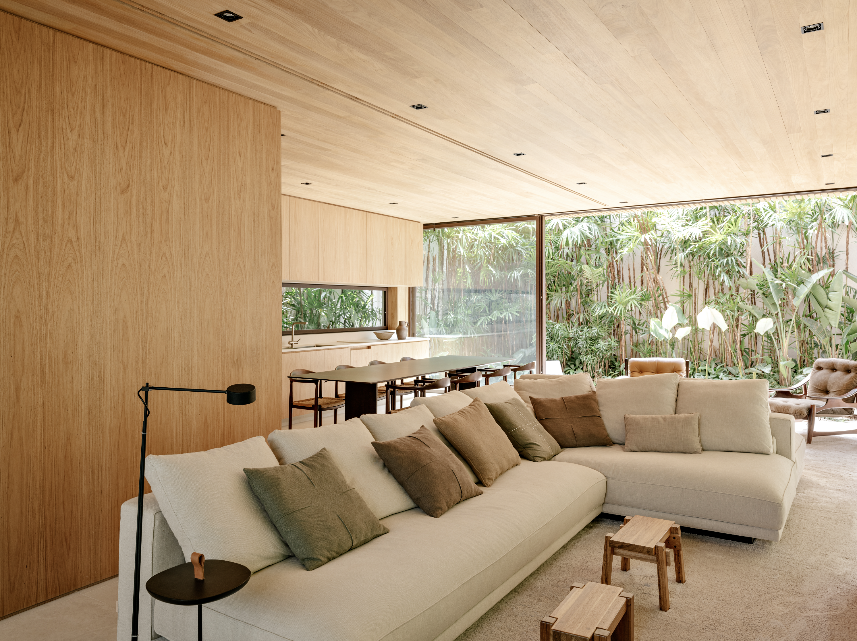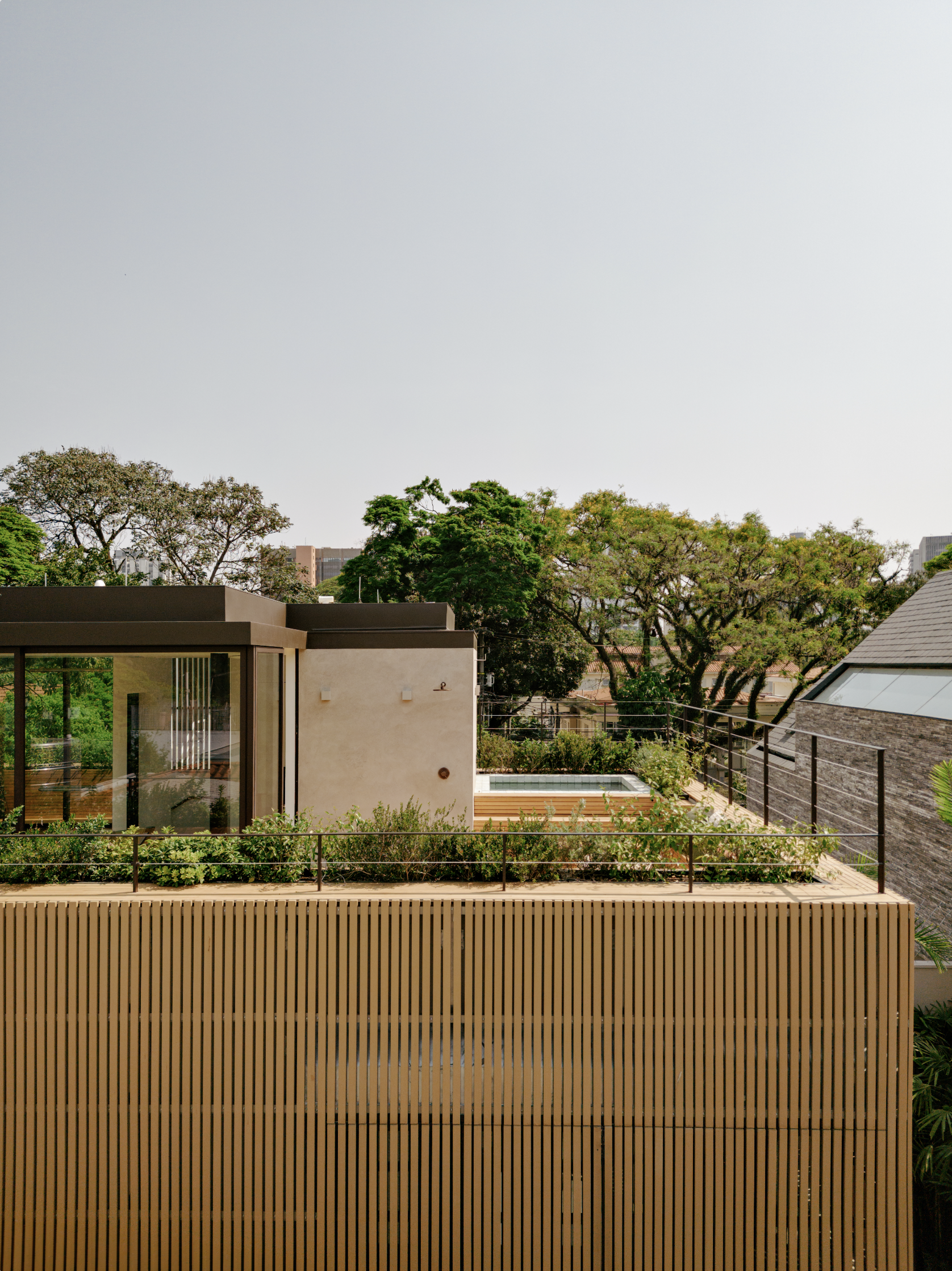 elementos naturales como chapas de madera en paneles y muebles de carpintería, así como piedra natural aplicada a paredes y suelos exteriores. Paisajismo integrado El proyecto de paisajismo, firmado por Rodrigo Oliveira Paisagismo, desempeña un papel fundamental en la composición.Una exuberante vegetación tropical rodea el volumen construido, creando una barrera visual para los muros limítrofes y acentuando la sensación de privacidad y acogimiento.
