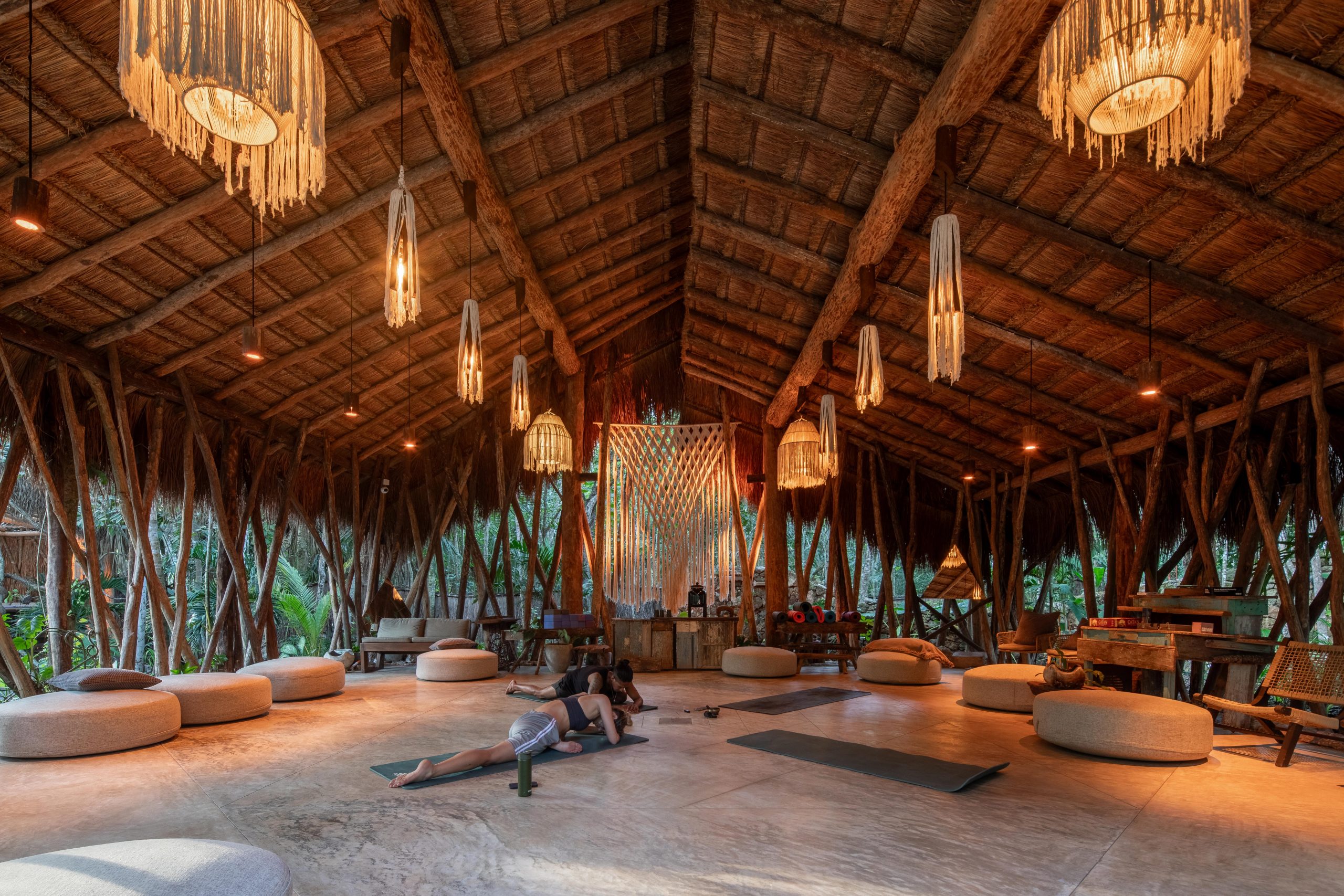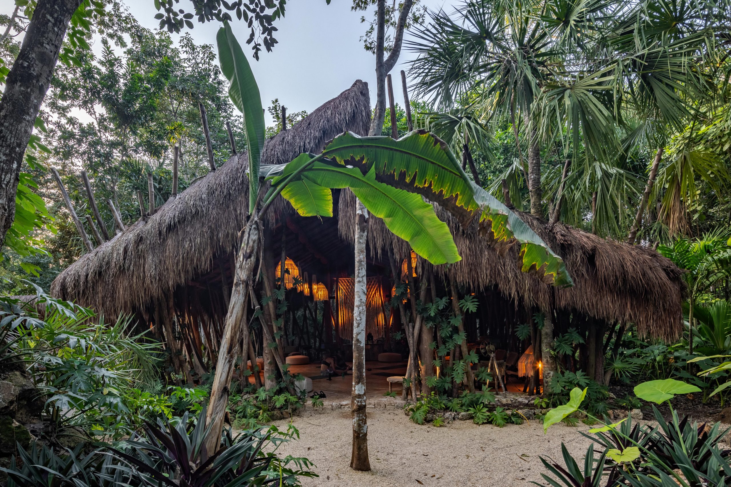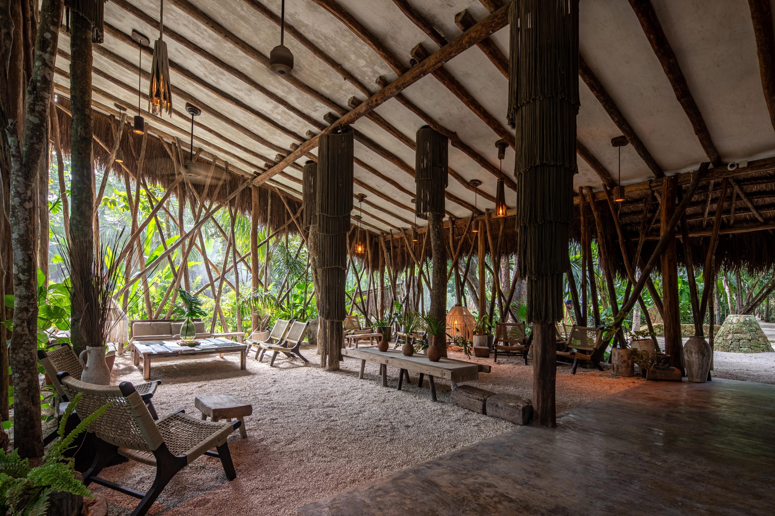 El restaurante está enclavado en la pendiente liberando la vista de las cabañas detrás. Se diferencia por un icónico plafón conformado de troncos desordenados y superficies de pasto, que dan una apariencia primitiva sin abandonar el lucimiento de la artesanía. Se abre hacia la orilla de la laguna, donde se proyectan sobre la pronunciada pendiente una serie de deck´s elevados e interconectados con puentes que descienden hasta el agua: espacios que dan la sensación de estar entre las copas de los arboles con una vista inigualable de la laguna de Bacalar.