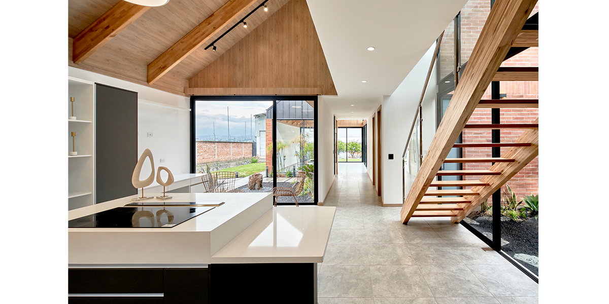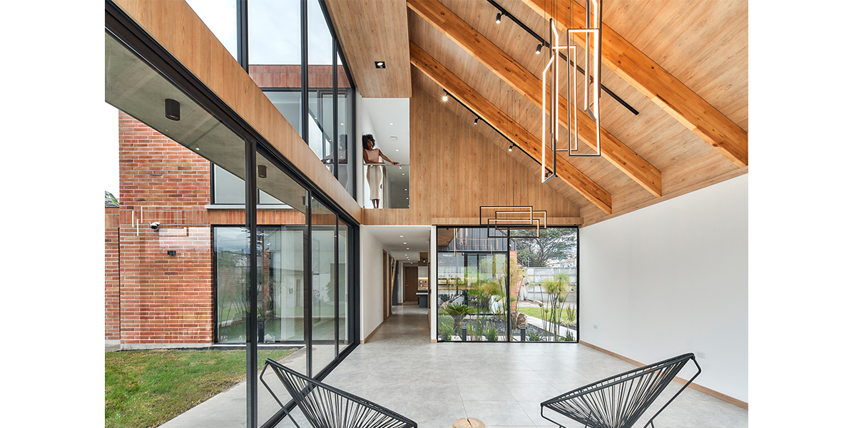 2 volúmenes fueron concebidos como una estructura libre a doble altura para las áreas sociales. 2 volúmenes de dos pisos albergan el programa privado.