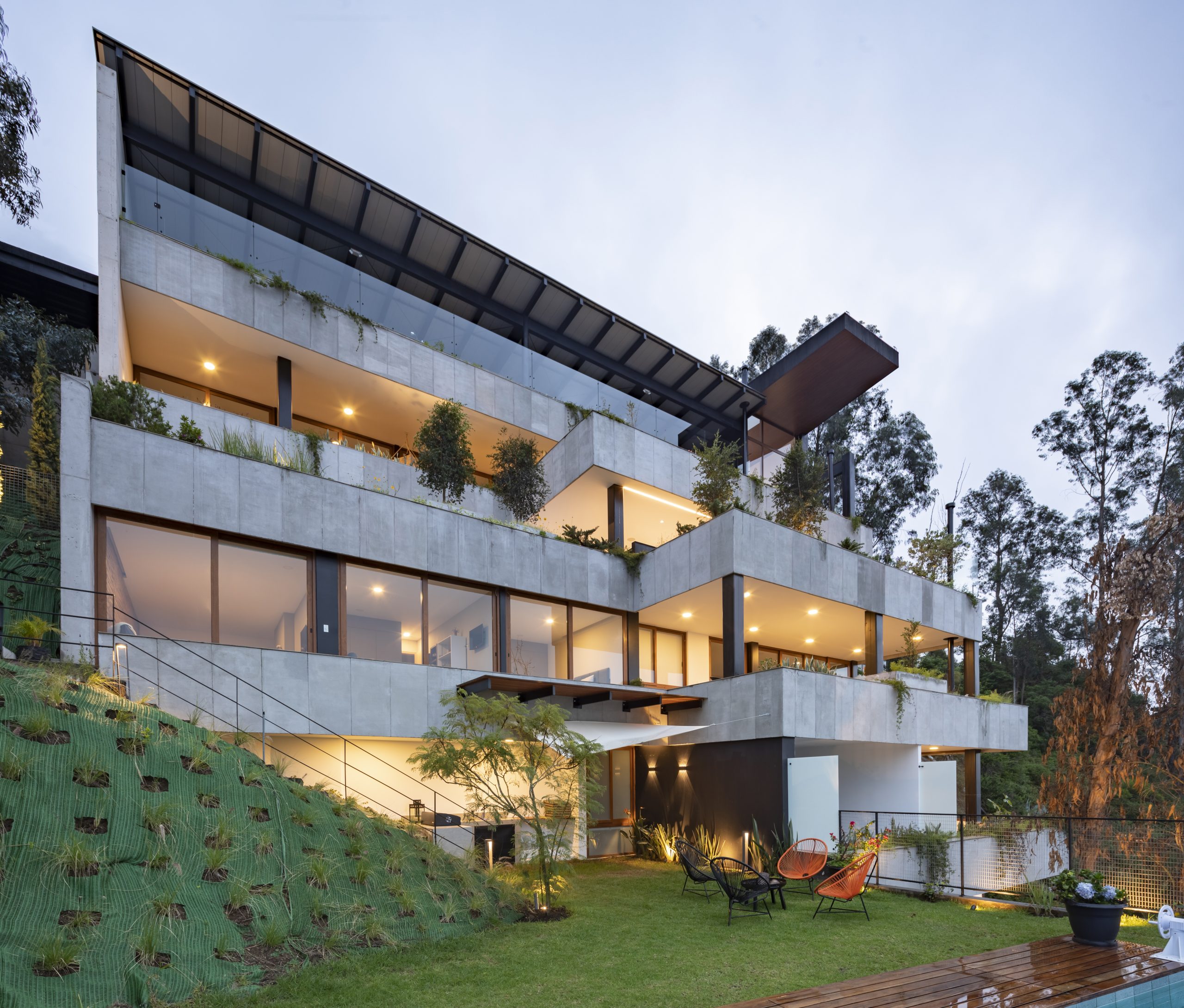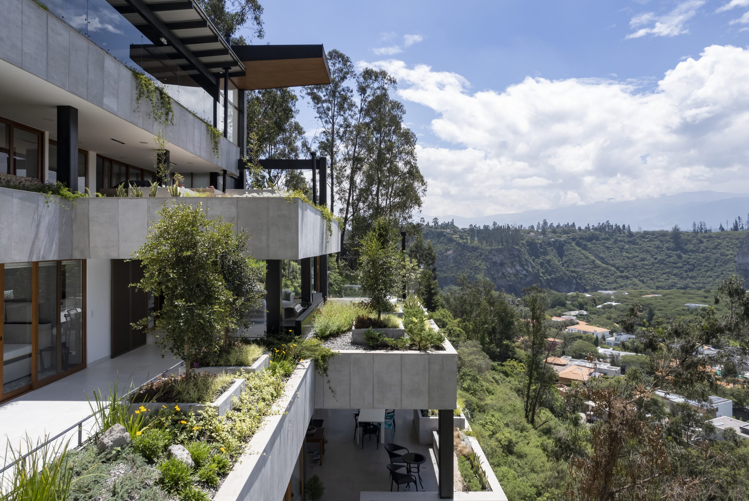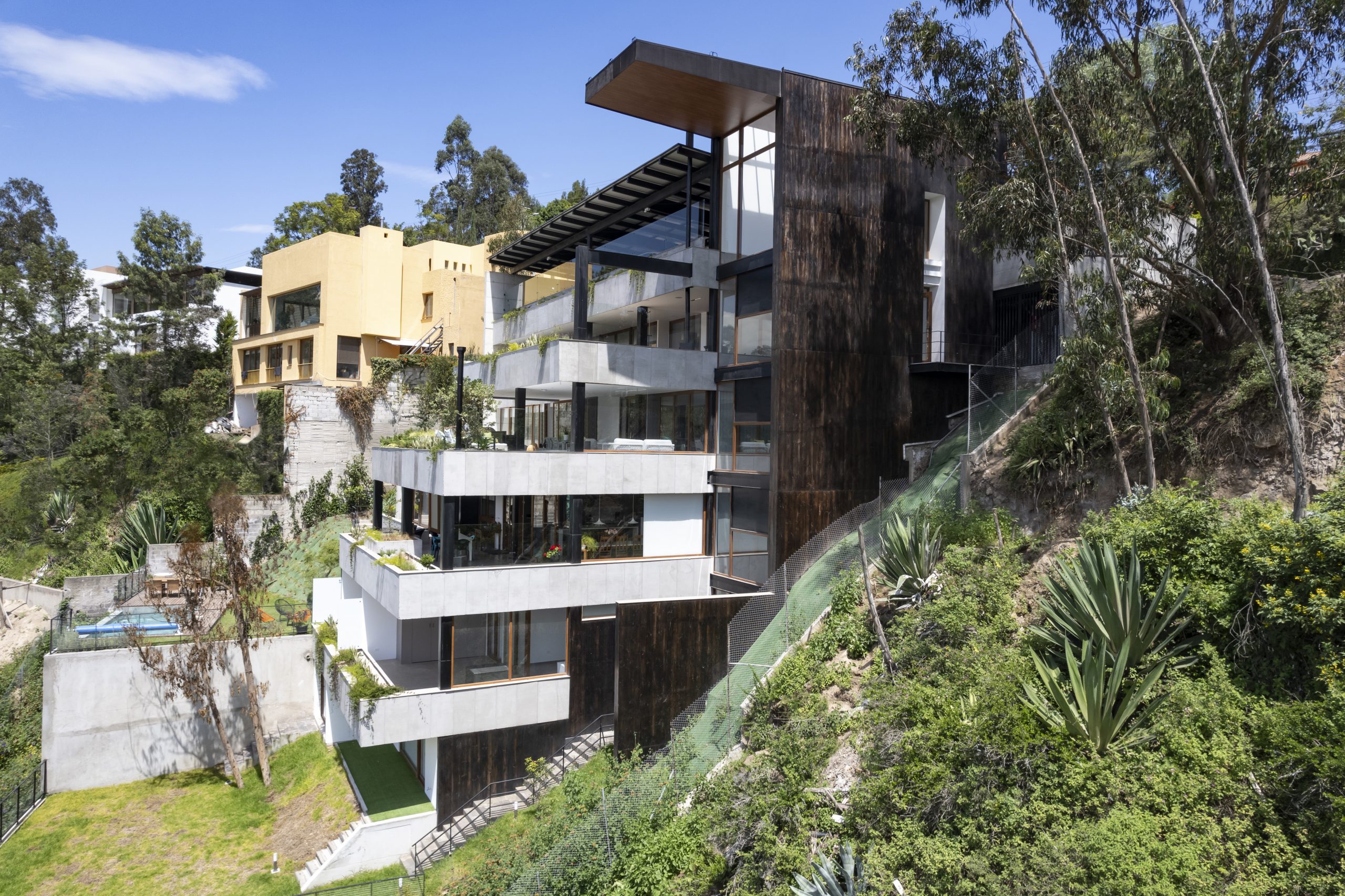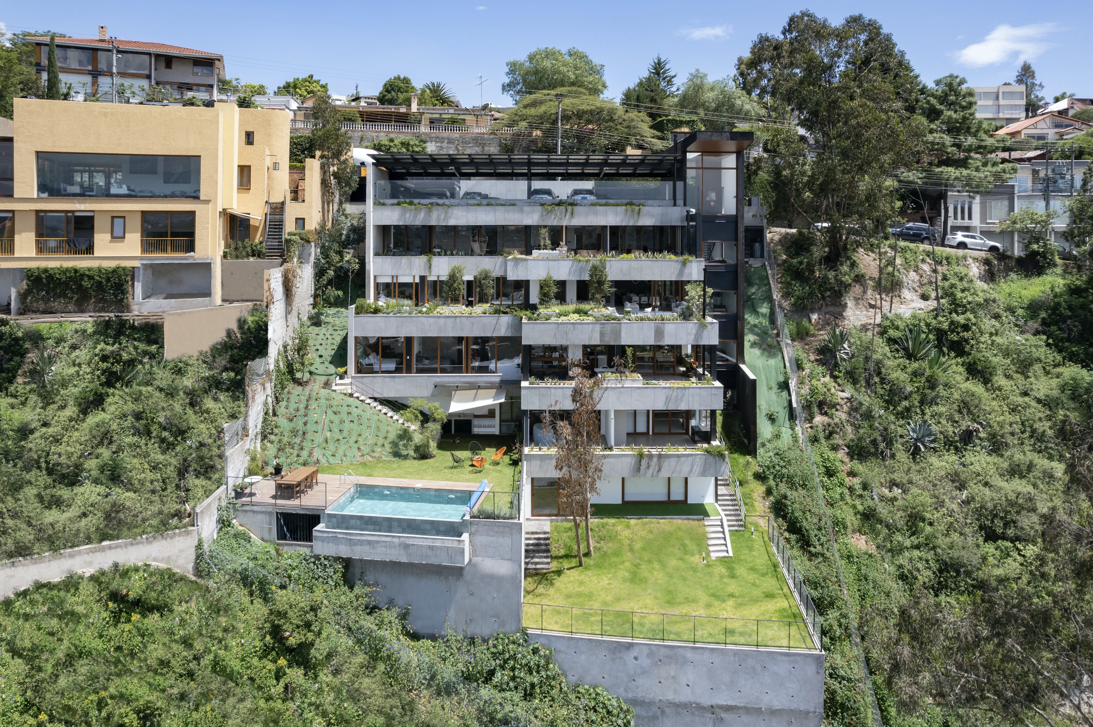 En una ladera con pendiente del 100% se implanta este pequeño edificio con 5 departamentos, el terreno está en el valle de tumbaco cuyo clima benigno permite la integración de los espacios interiores y exteriores.