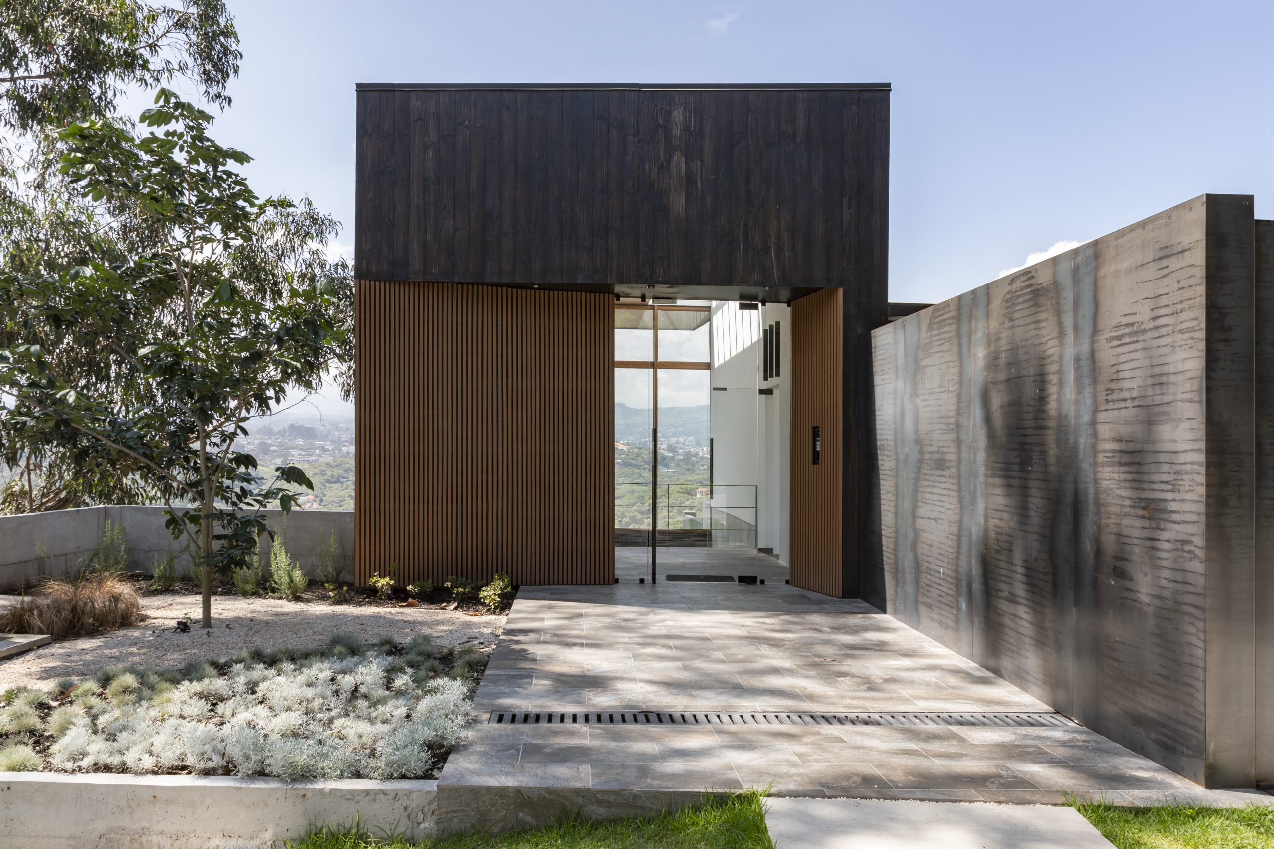 El sistema constructivo es mixto, estructura aporticada de acero y muros de hormigón proyectado, anclados a la ladera, las particiones internas son livianas con sistema steel frame y los cerramientos al exterior se resuelven con planchas de hormigón prefabricado en sitio, y duelas de madera certificada de pino, las cuales han sido tratadas con el proceso de carbonizado de origen japonés shou sugi ban.