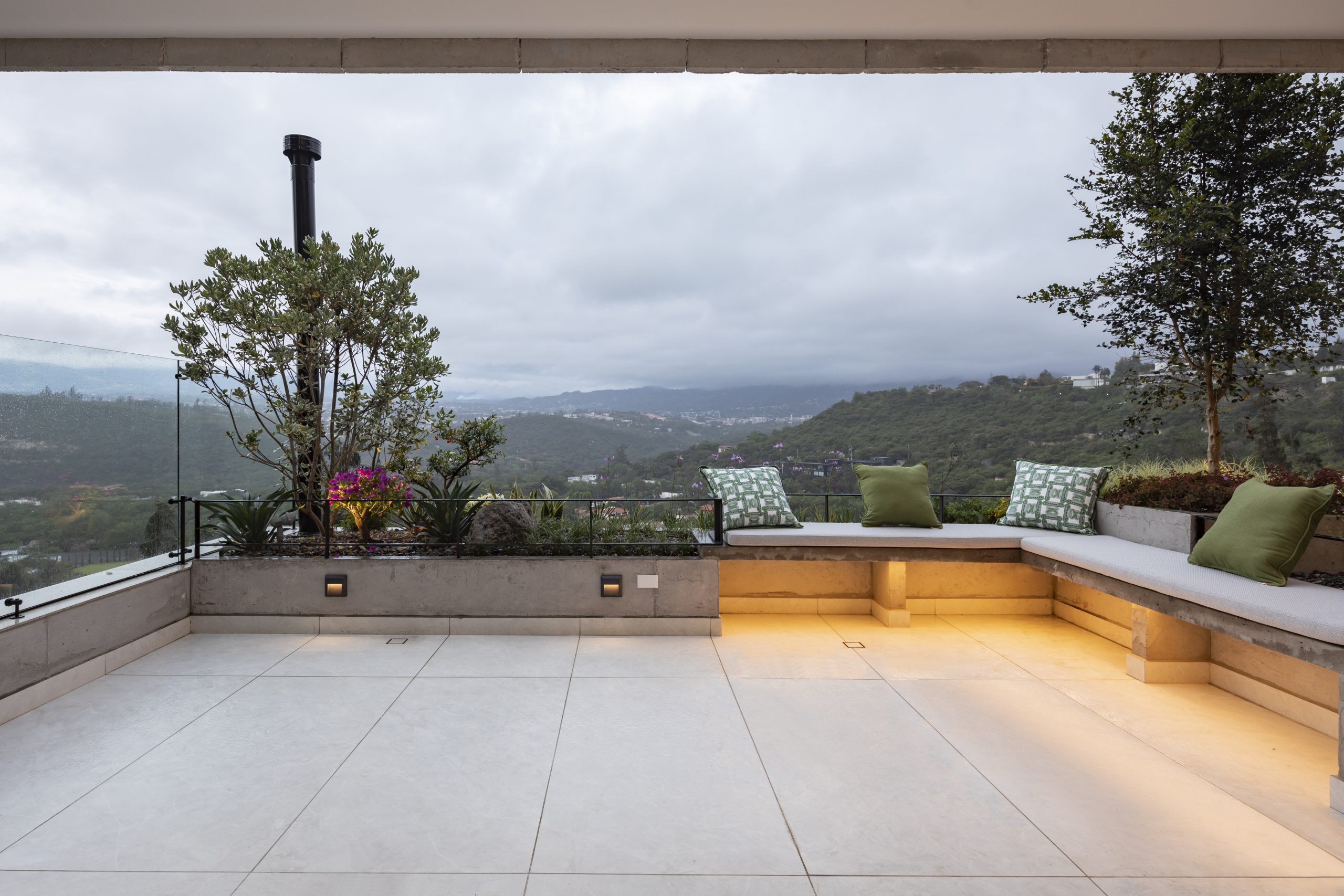 Se aprovechó esta condición para crear un vestíbulo de acceso que genera una cierta transparencia hacia el paisaje el cual es el verdadero protagonista del proyecto.