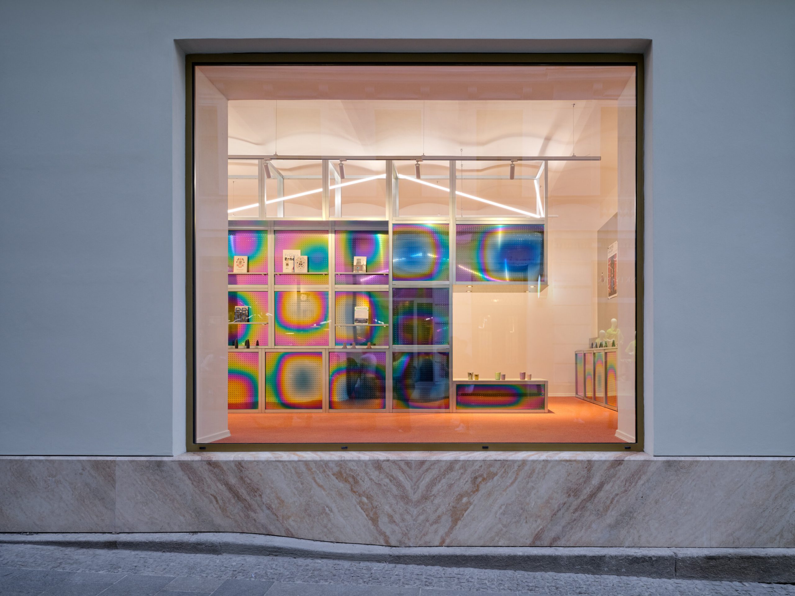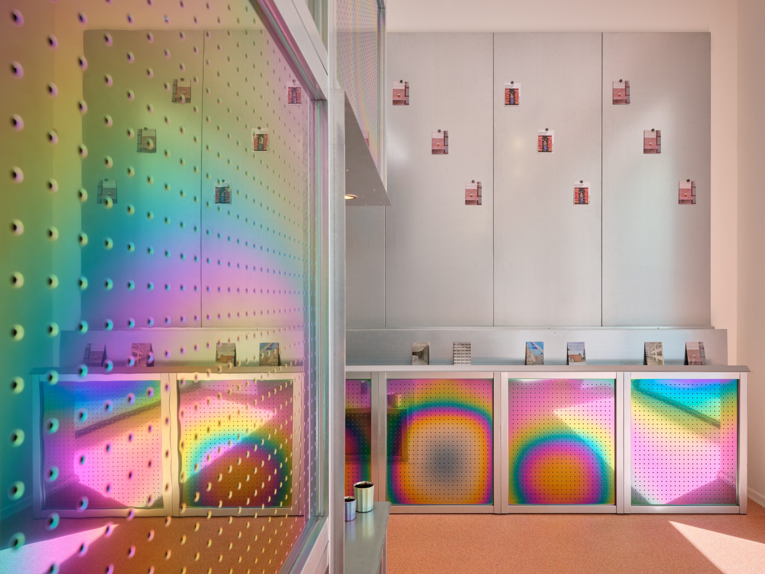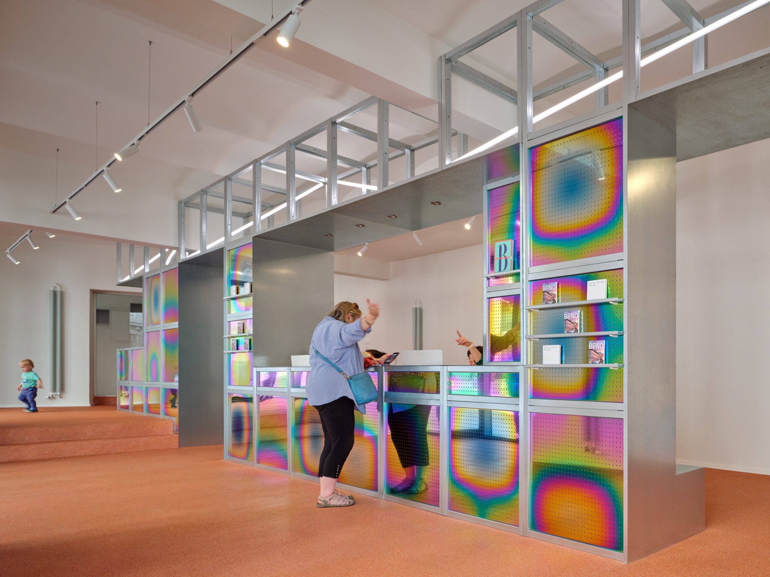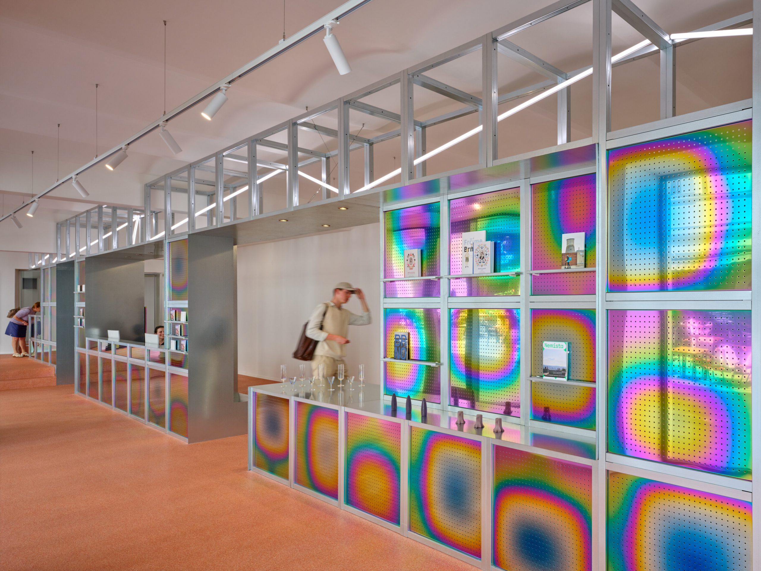 En el interior, la planta compacta se organiza en torno a un único elemento escultórico que consolida todas las funciones principales (recepción, espacio de trabajo, comercio, almacenamiento y exposición) en un único volumen espacial. Si bien el elemento define visualmente el espacio, también coreografía diversas interacciones del usuario mediante sutiles cambios en la forma y la materialidad. Los segmentos rebajados forman escritorios integrados para el personal y el uso de cara al público; nichos empotrados exhiben productos y publicaciones locales; volúmenes profundos albergan almacenamiento seguro; y los pasillos abiertos preservan la circulación. A medida que la luz natural se filtra por el espacio, los paneles iridiscentes la capturan y la dispersan sobre las superficies, proyectando sutiles gradientes que cambian con el paso del tiempo.