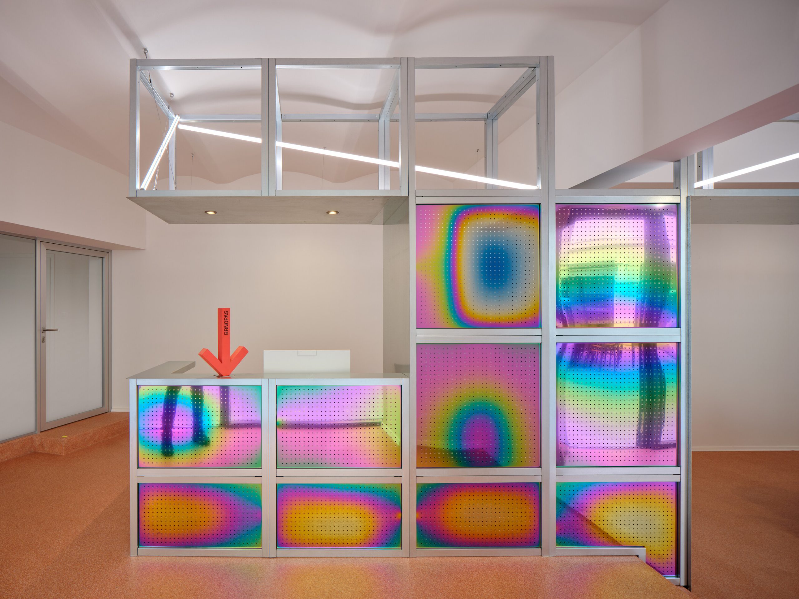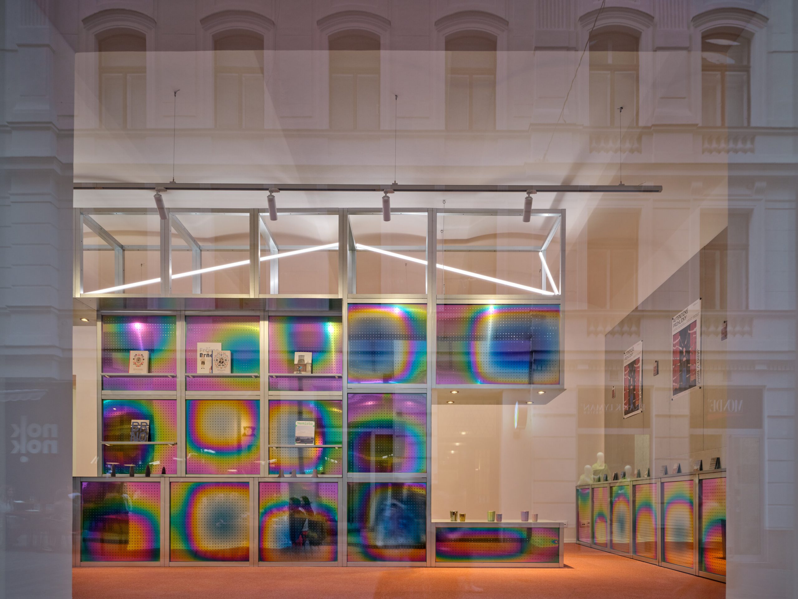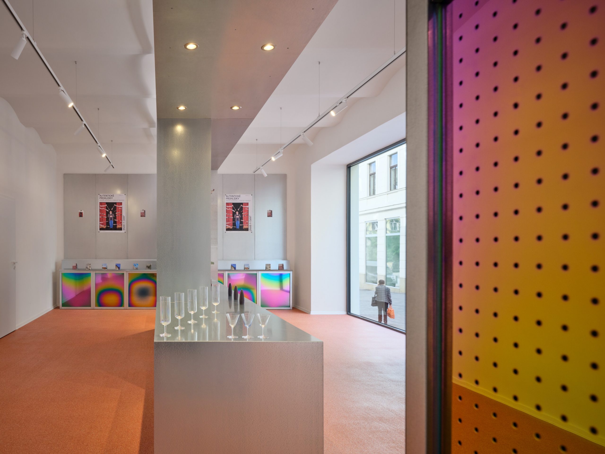 El inserto se desarrolló en colaboración con DURO Design, un estudio de fabricación multigeneracional con sede en Brno, especializado en metalistería avanzada. Casi un año de prototipos dio como resultado el acabado final: nitruro de titanio aplicado mediante un proceso de deposición física de vapor (PVD), con gases atmosféricos introducidos en la cámara de vacío para producir efectos iridiscentes impredecibles en cada panel de acero inoxidable. DURO también desarrolló un sistema de conexión a medida que permite un montaje sin fisuras y preserva el carácter monolítico del inserto. Su enfoque —adaptar métodos industriales para un uso orientado al diseño— encarna una filosofía artesanal basada en la experimentación, el conocimiento técnico y la claridad de los materiales.