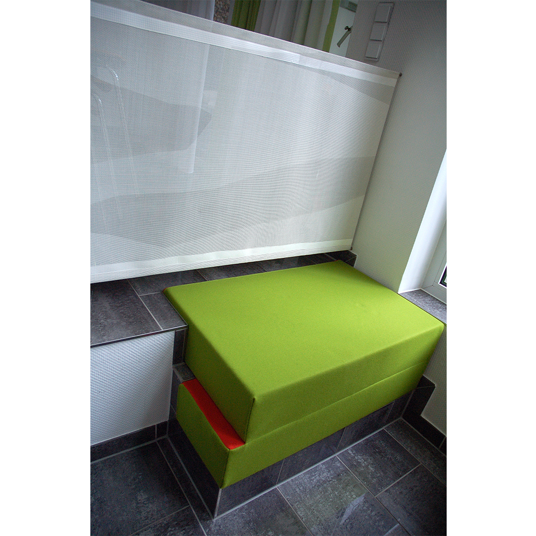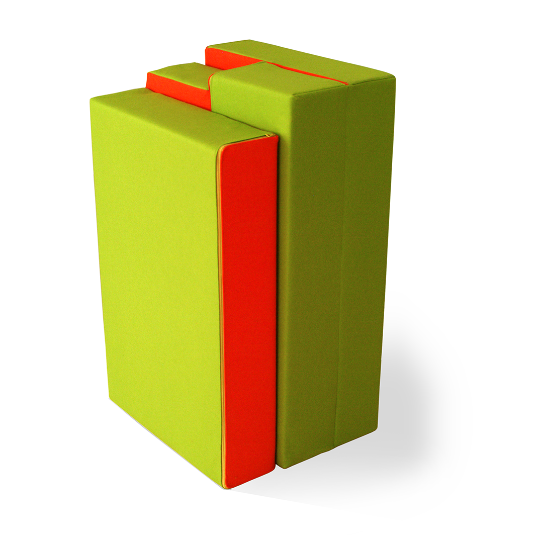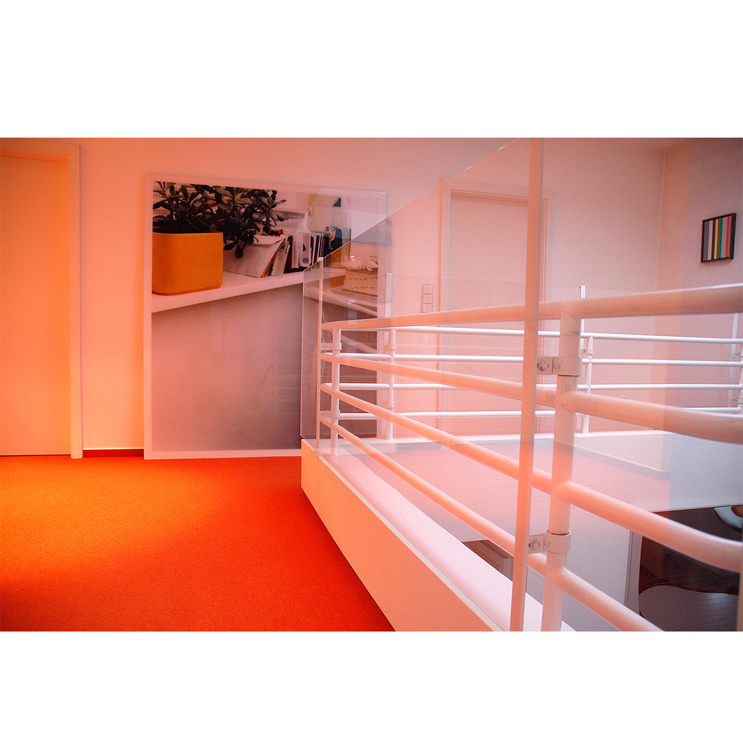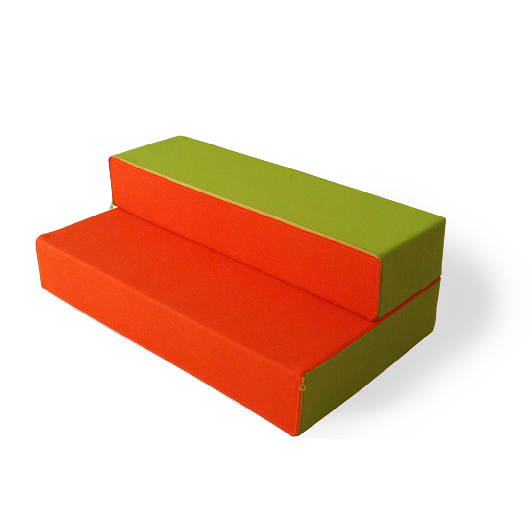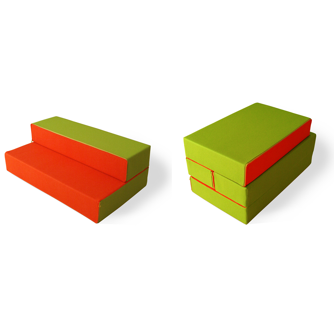 El apartamento incluye muebles diseñados a medida por la diseñadora de moda de Berlín, Elena Kikina. Se crearon cojines de asiento verdes y naranjas para bloquear las escaleras para que los niños no puedan lastimarse. Se pueden mover para sentarse, jugar o descansar en varias configuraciones únicas. Las almohadillas de los asientos están hechas de fundas de tela de fieltro sobre espuma densa con una abertura de cremallera que permite quitarlas y lavarlas. Los colores complementarios se eligieron para hacer referencia a la alfombra naranja en el primer piso y como un gesto de diseño lúdico para uso de los niños.