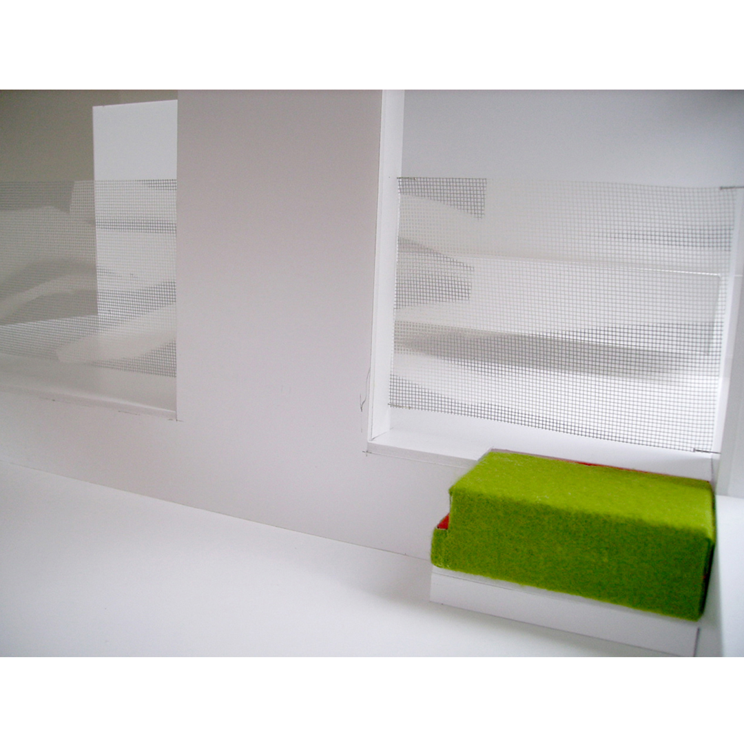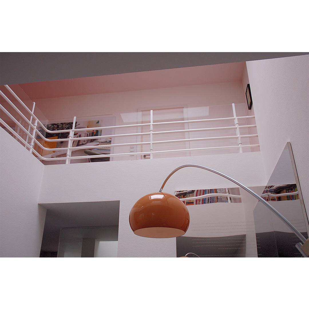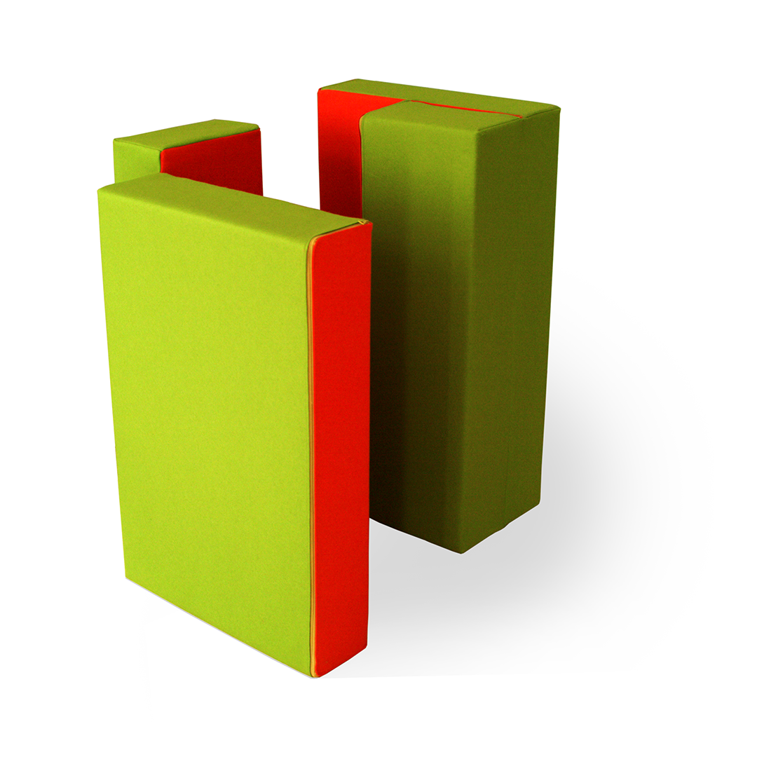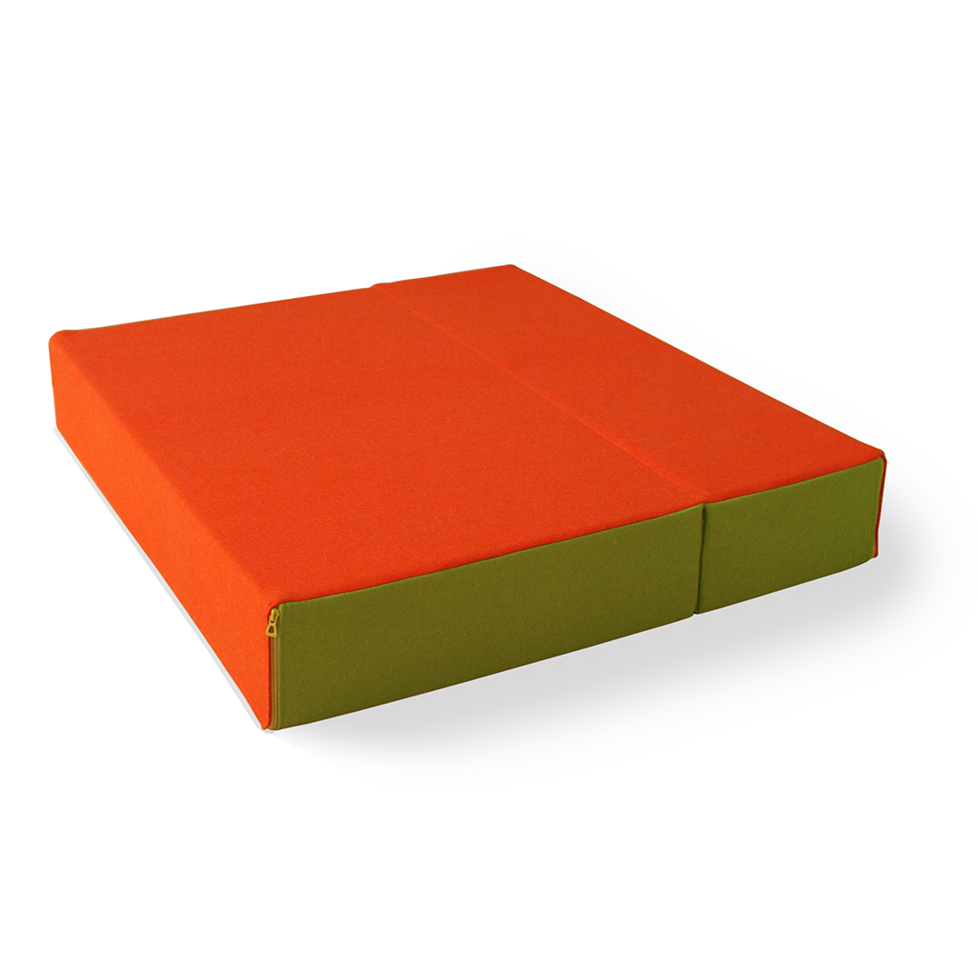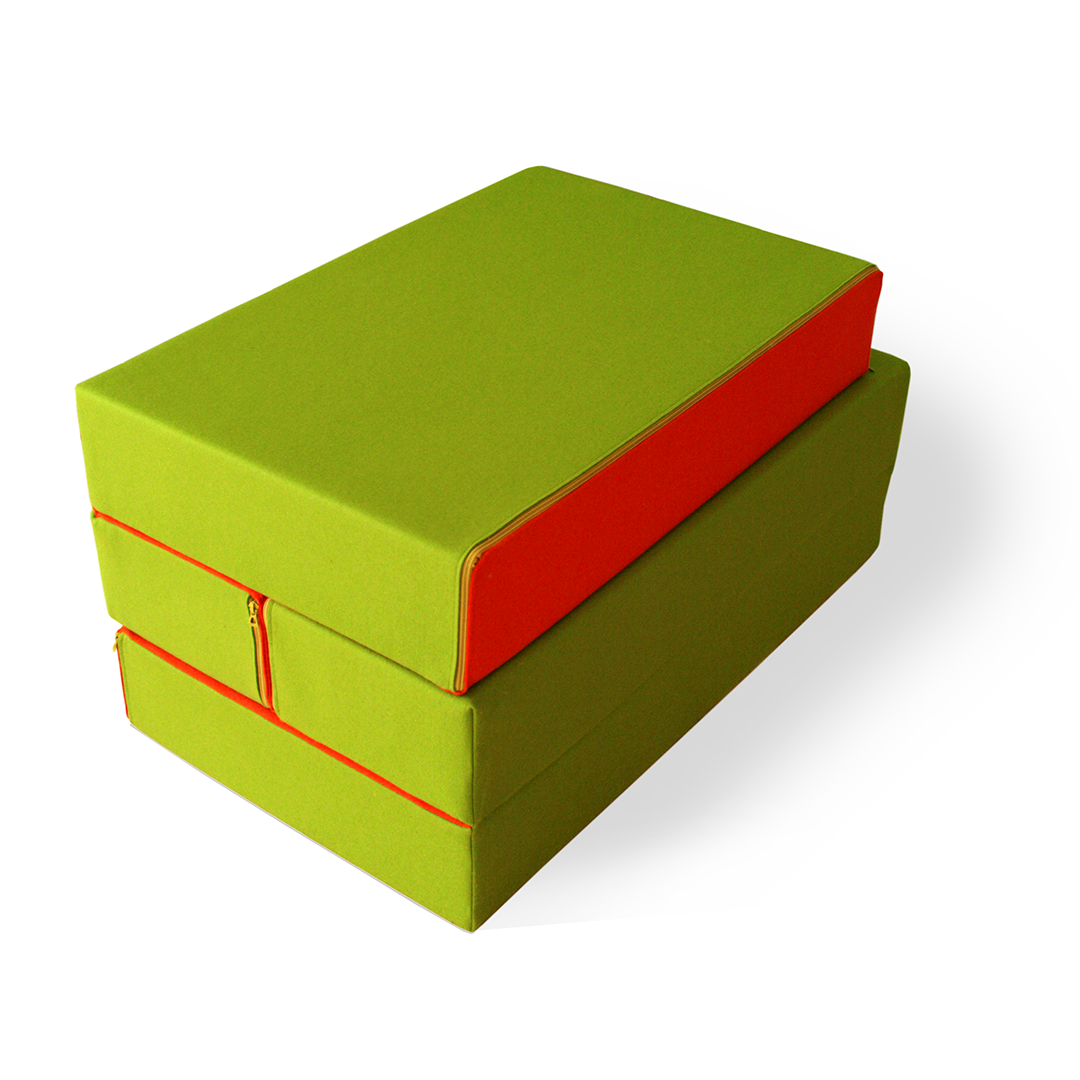 El apartamento incluye muebles diseñados a medida por la diseñadora de moda de Berlín, Elena Kikina. Se crearon cojines de asiento verdes y naranjas para bloquear las escaleras para que los niños no puedan lastimarse. Se pueden mover para sentarse, jugar o descansar en varias configuraciones únicas. Las almohadillas de los asientos están hechas de fundas de tela de fieltro sobre espuma densa con una abertura de cremallera que permite quitarlas y lavarlas. Los colores complementarios se eligieron para hacer referencia a la alfombra naranja en el primer piso y como un gesto de diseño lúdico para uso de los niños.