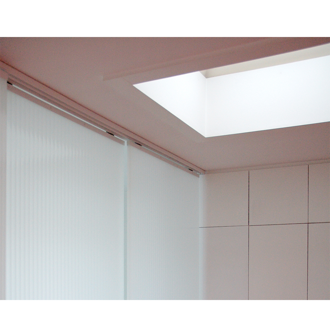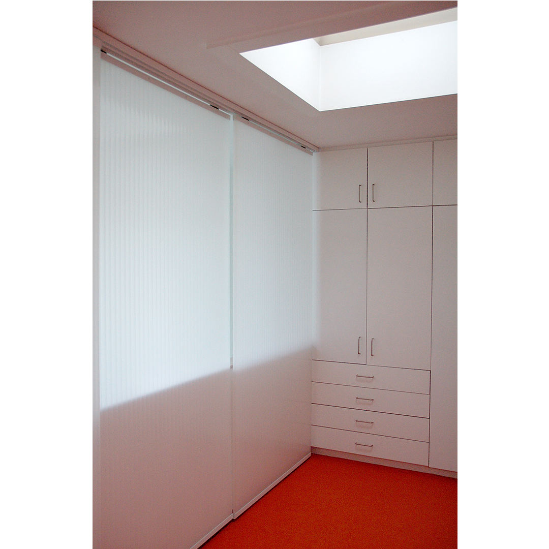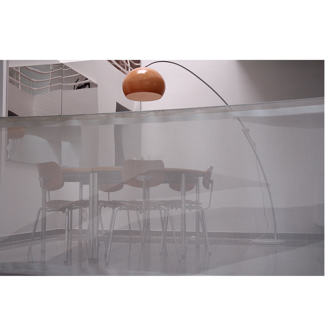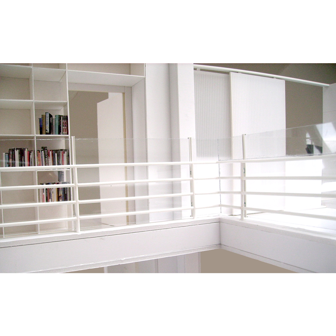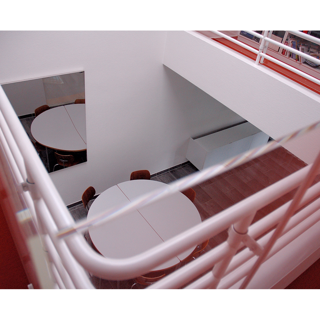 Los materiales fueron seleccionados para preservar la integridad del diseño del edificio existente. United Architektur seleccionó materiales con una jerarquía de transparencia relacionada con sus intervenciones de diseño. La malla de poliéster blanco, las puertas corredizas de policarbonato translúcido, los accesorios de metal revestido de blanco y la nueva protección de pasamanos de plexiglás para el entrepiso se suman al diseño interior de manera sutil al tiempo que crean importantes conexiones visuales entre los espacios.