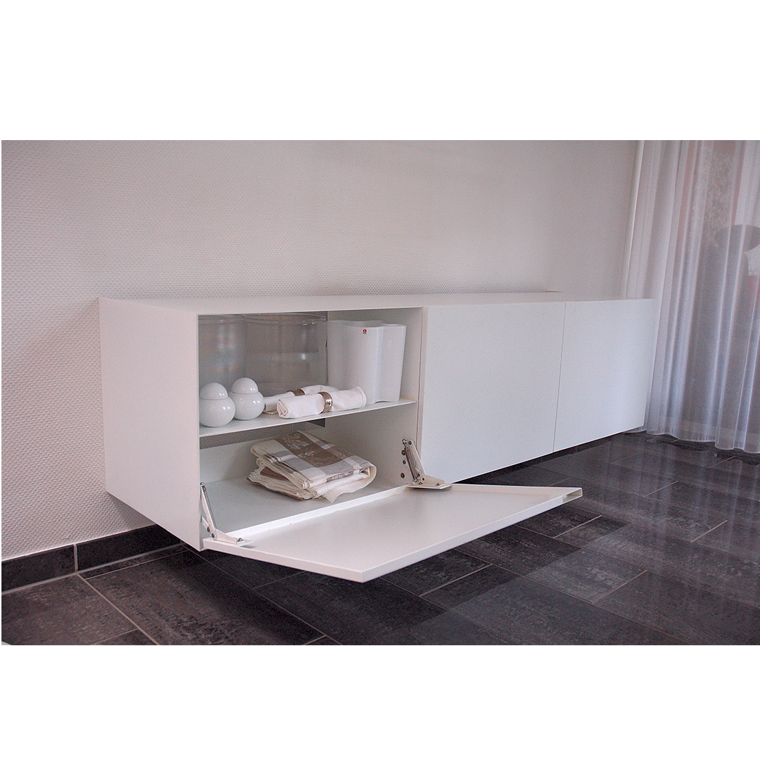 El nuevo aparador suspendido, realizado en metal revestido de blanco, se separa de la pared mediante un aplique lateral que confiere al mueble una sensación de ligereza. Tiene tres aberturas con bisagras superiores que brindan almacenamiento accesible para la vajilla en el comedor.