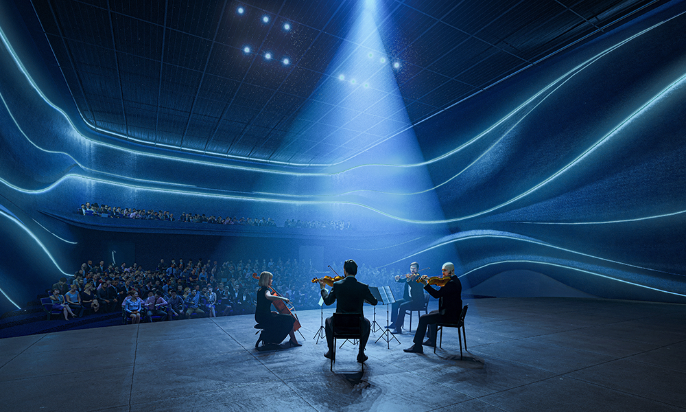 Organizado como una serie de volúmenes fluidos, capas y superficies que se interconectan con patios y paisajes, el diseño define una secuencia de espacios culturales y recreativos interiores y exteriores para su comunidad.