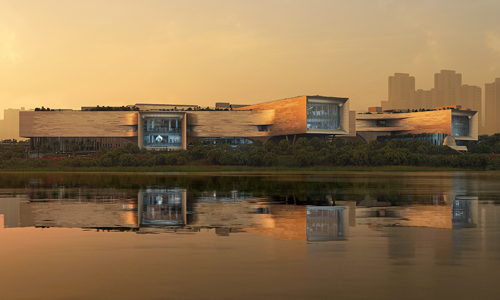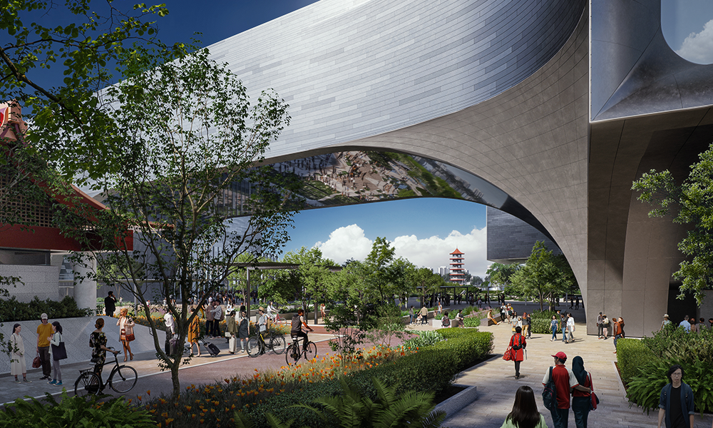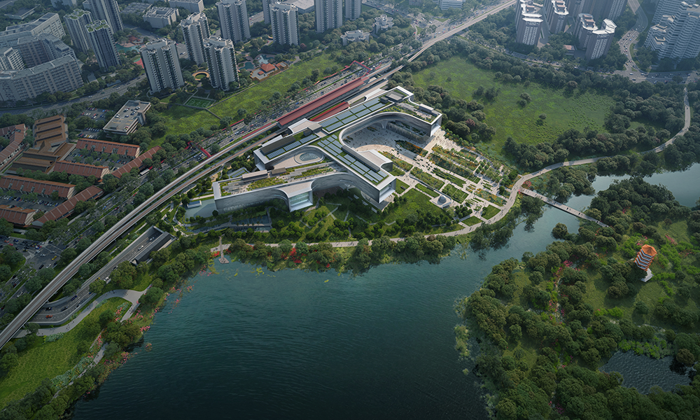 Incorporando grandes ventanas que sirven como ‘monóculos’ que ofrecen vistas estratégicas del lago, cada uno de los cinco volúmenes del nuevo Centro de Ciencias está orientado de manera única para mejorar las relaciones entre los espacios interiores y exteriores del centro. Pareciendo flotar sobre el parque circundante, el diseño define una serie de patios y jardines que van desde la estación de MRT adyacente hacia la pagoda dentro del Jardín Chino. Junto con diversos espacios interiores, exteriores y en la azotea para el aprendizaje, el nuevo Centro de Ciencias será un destino emocionante para encontrar la ciencia y la naturaleza, además de ofrecer muchas oportunidades para eventos comunitarios.