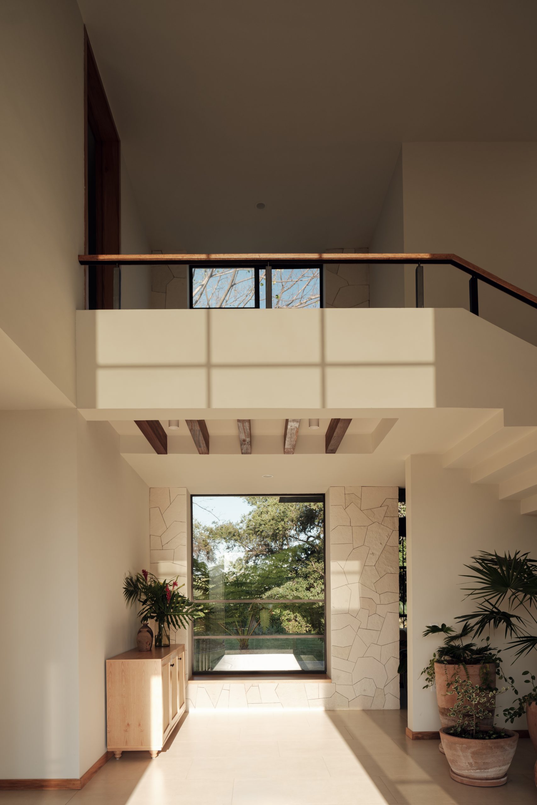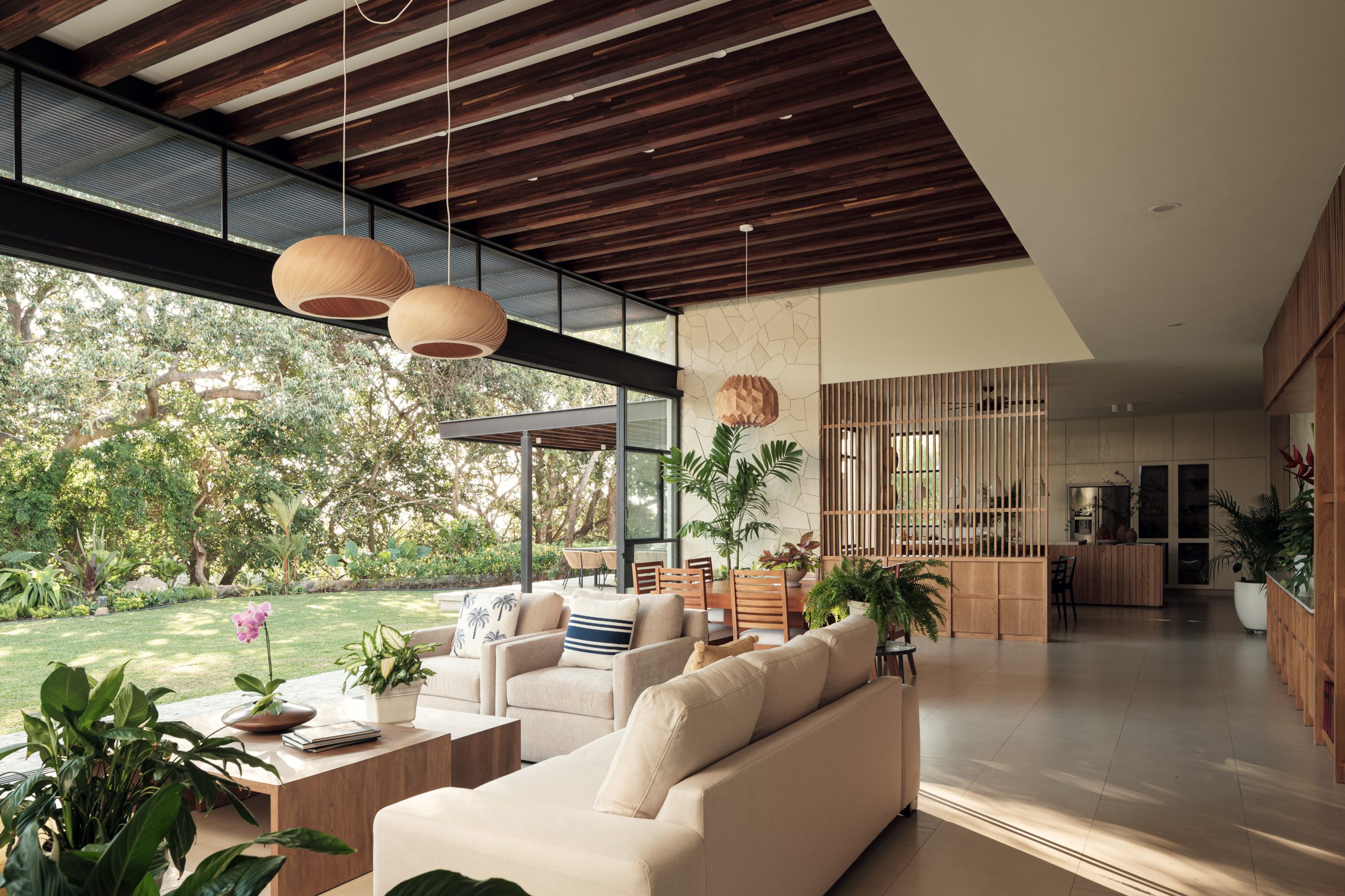 La decisión de alinear la construcción con la vista principal del terreno no es meramente un gesto práctico; es una declaración de principios. La arquitectura, aquí, es un medio para enmarcar lo esencial: la conexión con la naturaleza y el respeto por los ritmos del entorno. Cada apertura, cada línea de visión, se orienta hacia ese espacio posterior, donde el verdor y la sombra de la Parota ofrecen un refugio visual y espiritual.