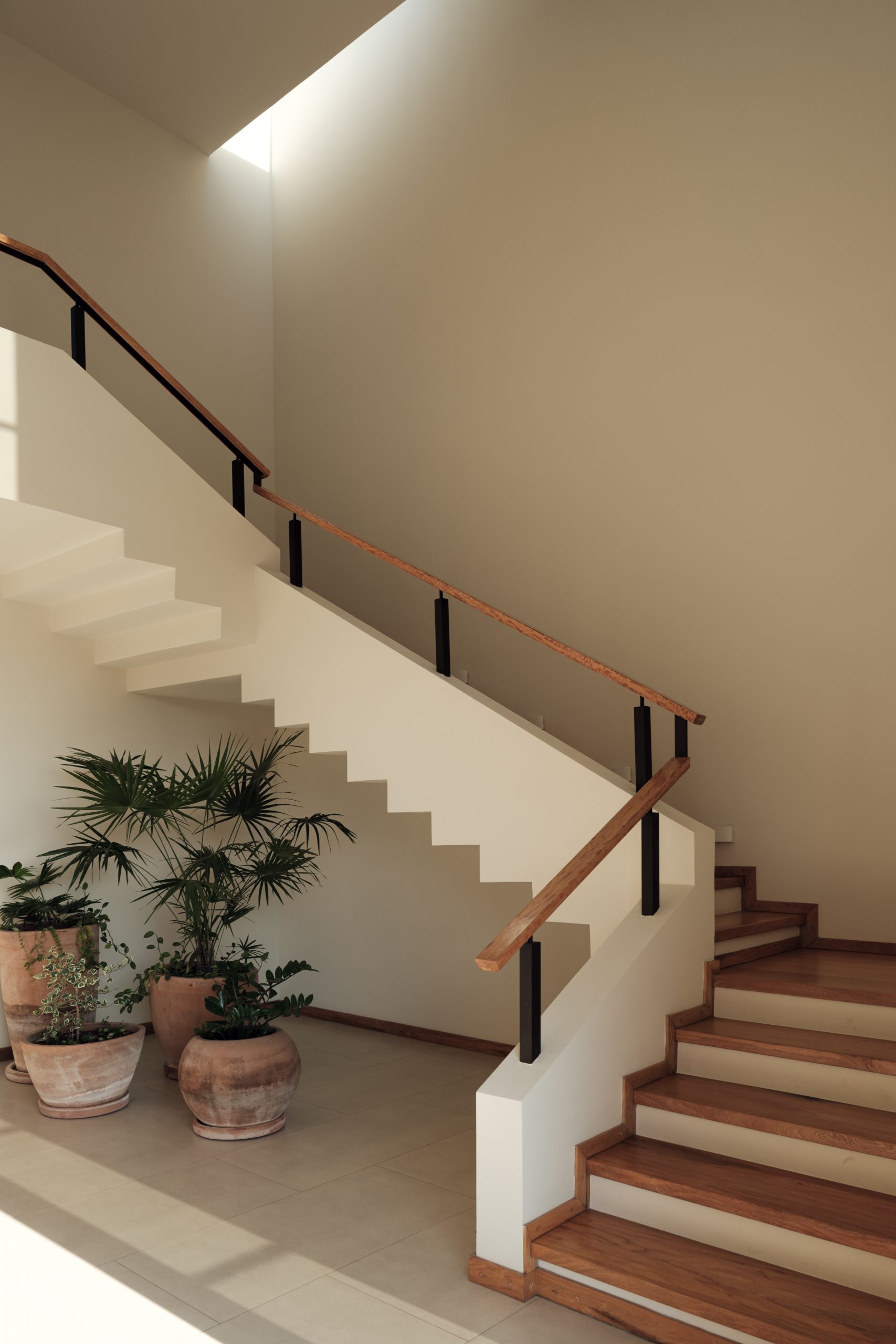 La disposición de los espacios refleja esta dualidad: lo íntimo y lo social coexisten sin conflicto, cada uno con su lugar y su propósito. La planta baja se convierte en un microcosmos donde el día a día del habitante se desenvuelve con naturalidad. Desde un umbral se accede a un recibidor de doble altura, un preludio que sugiere la magnitud y elegancia del interior. Las escaleras hacia la planta alta, con su ventana que enmarca el jardín, invitan a la reflexión, mientras que la división en dos secciones —privada y pública— permite una convivencia armoniosa entre el resguardo personal y la apertura al encuentro.